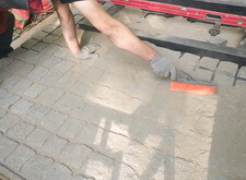 Засыпаем брусчатку пескобетоном, снимаем лишний слой, замываем.