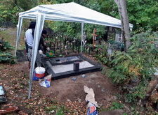 Следующим этапом стали внутренние работы: мы собрали цветник, укрепили основание для памятника и подставку под вазу. Остальную территорию участка застелили геотектстилем, который будет препятствовать прорастанию травы сквозь брусчатку. К сожалению, в разгар работы нас застиг дождь, а потому участок пришлось накрыть тентом.